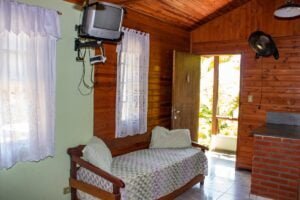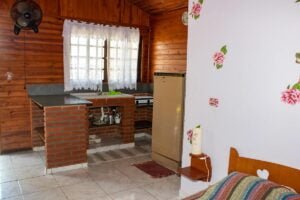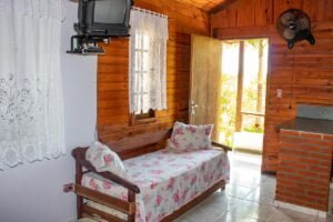 Todos os chalés possuem banheiro com chuveiro a gás, cama de casal e bi cama, ou, cama de casal e beliche, tv, espaço gourmet com geladeira, fogão e utensílios, na sua varandinha uma charmosa churrasqueira.